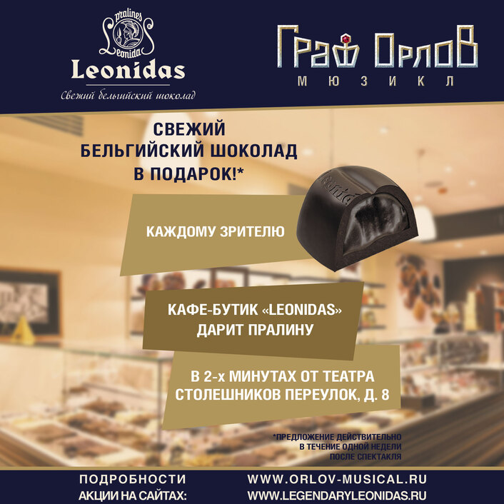 Теперь и вы вслед за королевскими особами и голливудскими звездами сможете угоститься легендарным шоколадом. Каждому пришедшему зрителю мюзикла «Граф Орлов» кафе-бутик Leonidas подарит знаменитую шоколадную пралину, причем вкусный подарок можно будет даже взять с собой в фирменной упаковке.